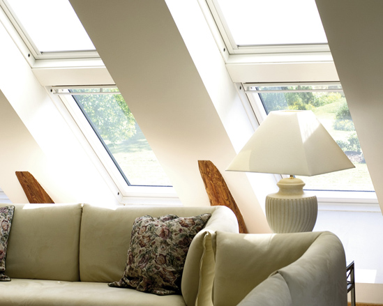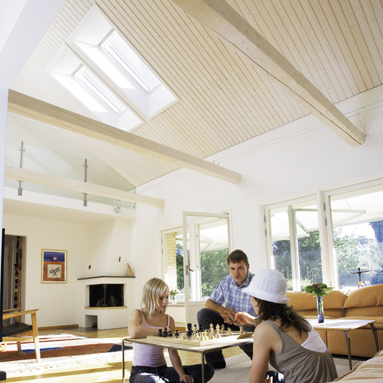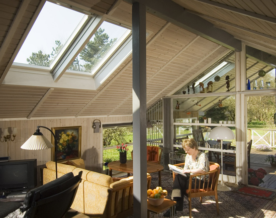 Selv om dit hus har tag med skråloft til kip, har du alle muligheder for at få dit eget soltag. Næsten hvor som helst i stuen kan der skaffes nyt lys og luft. Det er ene og alene et spørgsmål om skylightenes antal og placering.
