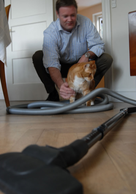 ”Vi har to katte og har også haft hund. Hunde- og kattehår er noget af det værste for en støvsuger, og den slags organisk materiale be-gynder hurtigt at lugte, når det bliver gemt i maven på en almindelig støvsuger, der returnerer den ildelugten luft lige ud i stuen, når den er tændt,” siger Andrew Peck.