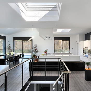 Mange inspireres i dag af den minimalistiske funkisstil med fladt tag. Her er det oplagt at trække dagslyset ind i boligen gennem det flade tag med en VELUX ovenlyskuppel. Kuplen giver maksimalt dagslys i hjemmet, et godt indeklima og er et energi- og miljømæssigt sikkert valg.