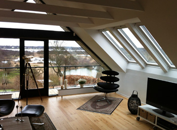 Det var udsigten over det grønne søområde, familien faldt for, da de sidste år købte deres nye hus. Men inden de flyttede ind, blev de enige om, at 1. salen trængte til en gennemgribende renovering. De mørke træ-listelofter blev skiftet ud med hvide gipsplader, og tre nye VELUX ovenlysvinduer blev installeret mod vest. Alt sammen løsninger, der har givet stuen et løft og et lysere og mere indbydende indtryk.