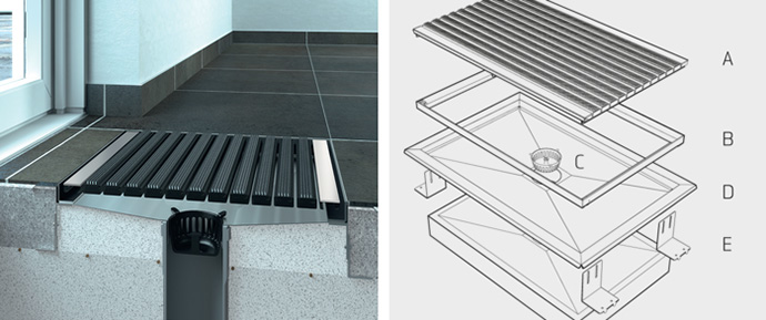 Under måtten ligger trævlesien, som fanger småsten og grus. Nederst ligger armaturet, som støbes fast i gulvet. Montageelement kan tilkøbes for at lette støbeprocessen.