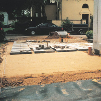Armeringsnettet kan med fordel udlægges under granitskærver, perlesten og lignende, så disse ikke trykkes ned i underliggende lag, og samtidig vil de underliggende lag blive armeret.