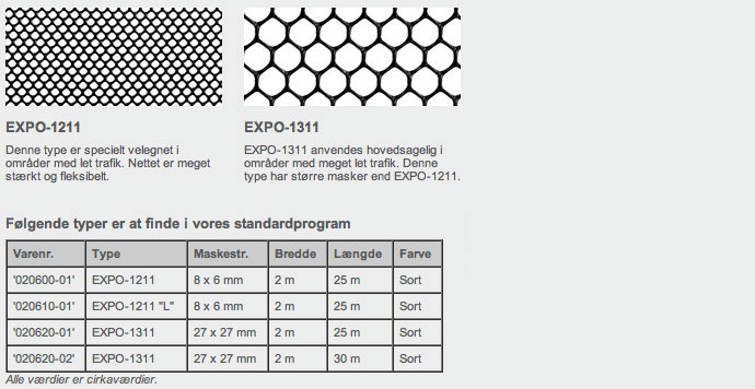 Græsplænen kan med stor fordel forsynes med EXPO-NET armeringsnet på steder, der f.eks. skal bruges som midlertidige parkeringspladser til gæsterne. Eller ved større eller mindre ombygning hvor du skal have kørt materialerhelt ind til huset af store lastbiler, midlertidige veje og lignende i forbindelse med reception, åbent hus, udstillinger, dyrskuer, koncerter eller osv.