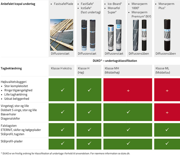 I undertagsnøglen nedenfor, får du et overblik over de forskellige undertagsmuligheder samt deres DUKO* klassifikation. Icopals undertage er klassificeret i DUKO, som er en frivillig og uafhængig ordning for klassifikation af undertage.
