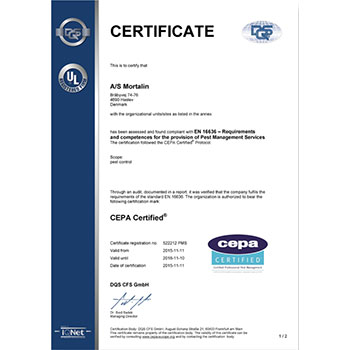 Mortalin er det første skadedyrsfirma i Norden og nr. 5 i Europa, som er godkendt efter standarden EN16636.