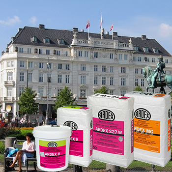 Det historiske hotel d’Angleterre i København har siden 2011 været under renovering, og overalt er der fokus på at bevare kvaliteten af de gamle bygninger. Tag nu badeværelserne: Her anvendes fliseklæberen ARDEX S 27 W, vådrumsmembranen ARDEX 8+9 og fugemørtlen ARDEX MG, som sikrer, at de nye kalkstensfliser ikke misfarves under opsætningen.