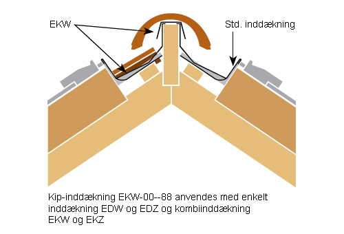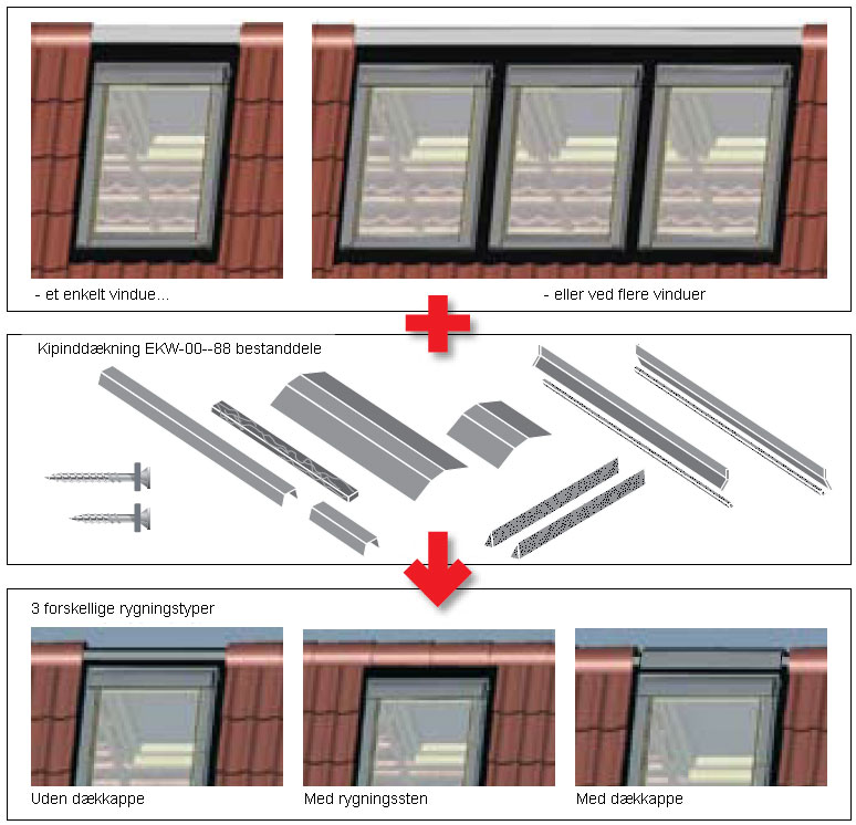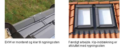 Kip-inddækning EKW-00–88 leveres med udførlig monteringsvejledning, der trinvis beskriver udførelsen af rygningsløsningerne over ovenlysvinduerne.