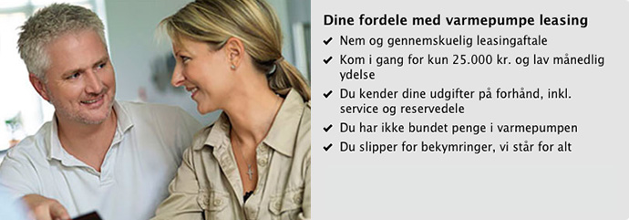 Du leaser din varmepumpe i 10 år. Betalingen består af en engangsydelse på 25.000 kr. Derudover betaler du kun en månedlig ydelse. Priserne starter fra 1.095 kr. og er inkl. levering, installation, service og vedligeholdelse. Leasing handler nemlig om at gøre det så nemt og bekvemt for dig som overhovedet muligt.