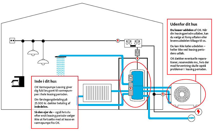 OK Varmepumpe Leasing giver dig fuld brugsret til varmepumpen i hele leasingperioden. Engangsydelsen på 25.000 kr. dækker betaling af indedelen, så den ejer du. Det er selve udedelen, som du leaser af OK.