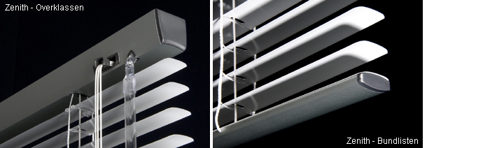 Bundlisten er teknisk set helt unik. Ingen snore eller propper i bundlisten, da stigebåndene føres ind fra siden. Samtidig gør to små pinolskruer i monteringsdelen det muligt, at justere persiennehøjden helt præcis efter opsætningen. Lamelafstanden er 20 mm, hvilket giver den mest optimale overlapning af lamellerne, når persiennen er lukket. Afstanden fra øverste lamel til overkassen er minimal, ligesom den tekniske løsning af drejningen af stigebåndene gør, at Zenith persiennen lukker bedst, teknisk muligt.
