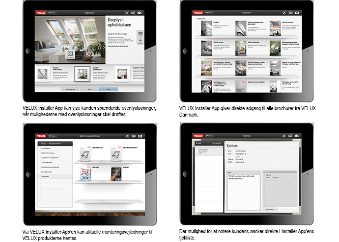Installer App’en til iPad hjælper håndværkeren med at gøre kundebesøget både mere effektivt og meget mere interessant for kunden. Ved hjælp af Installer App’ens billeder og inspirerende videoer kan kunderne se, hvor meget ekstra dagslys et eller flere ovenlysvinduer kan tilføre et rum. Dermed sikres det rigtige beslutningsgrundlag, når løsningen skal findes. ”Fra flere håndværksmestre har vi allerede hørt, at den nye Installer App er et velfungerende og inspirerende værktøj i forbindelse med kundebesøg”, siger Finn Arup, salgschef hos VELUX Danmark.