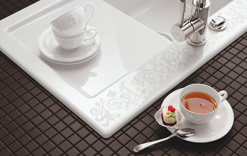 Som noget helt nyt præsenterer Villeroy & Boch også en keramisk håndvask med inkorporerede dekorationer. White Pearl hedder vasken, der for første gang overfører det succesfulde mønster fra Villeroy & Bochs populære og anerkendte porcelænsserier Grey Pearl og Ivory til køkkenvasken. Køkkenvasken giver en lang række designmæssige muligheder, når køkkenet skal indrettes.
