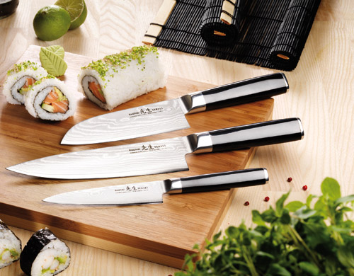 • Den nye Sensei Dama-serie består af en japansk urtekniv på 12 cm, en santokukniv på 15 cm og en kokkekniv på 20 cm.