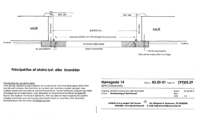– Det forlangende kunne husets oprindelige fyldingsdøre umuligt opfylde, og derfor skulle der på en eller anden måde monteres nye døre ind til kontorlokalerne. Bygherre, arkitekt og Kulturstyrelsen ville selvfølgelig ikke fjerne de flotte, originale dør i det fredede hus. Så vi skulle pludselig forene døre med 240 års malerlag med splinternye døre i samme dørhuller, siger Peter Buchholt Petersen, arkitekt M.A.A fra arkitektfirmaet Jørgen Toft Jessen.