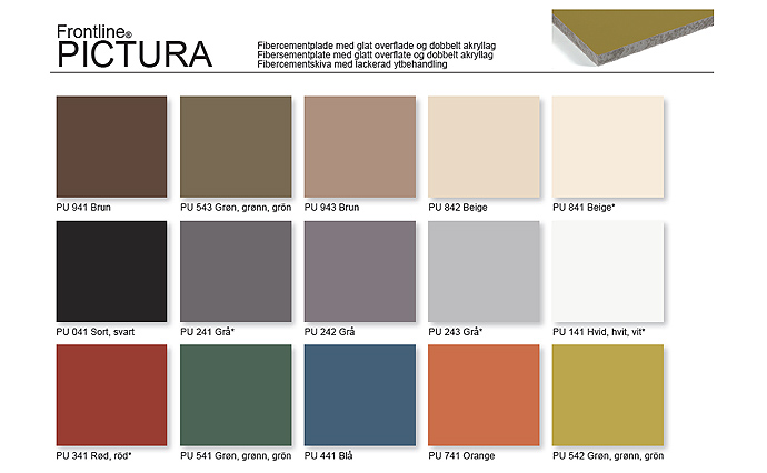 Fibercementpladen Pictura, fra ivarsson, er sidste skud på stammen i Frontline-serien. Den nye farveskala harmonerer med både nyt og gammelt byggeri. For nøjagtig farveangivelse rekvirer venligst farvekort/materialeprøve.