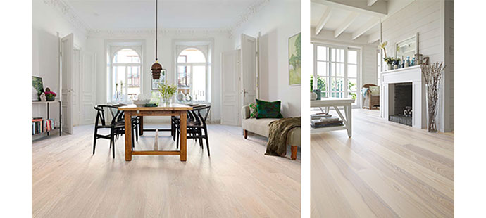 De klassiske hollandske tern i eg har fået et helt nyt udseende takket være pigmenteringen i hvid. Gulvet hedder Noble Eg Scandinavia. Pris fra 699 kr/kvm.