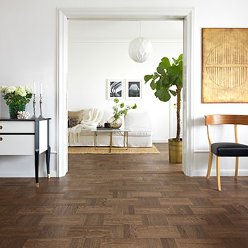 Blandt nyhederne fra Tarkett er det fantastiske Noble Eg Wasa, som er en nyfortolkning af de klassiske hollandske tern. Her ses det i en lækker mørkebrun nuance.