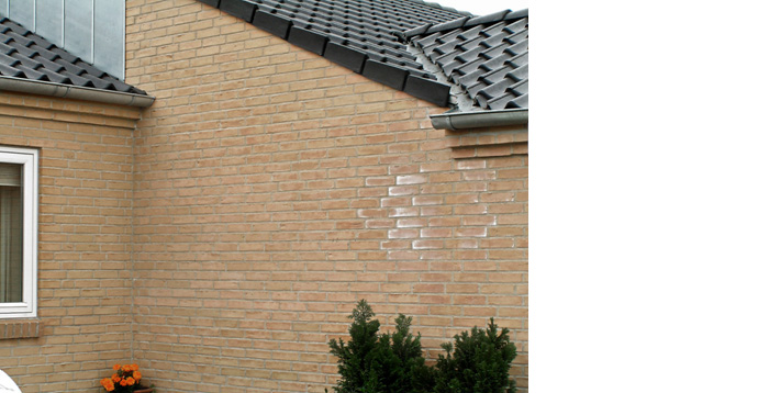 Skaderne består af 1) Misfarvninger i form af gipsudfældninger fra mursten og mørtel, 2) Misfarvninger pga. udvaskning af kalk fra fuger, 3) Frostskader i fuger længe efter opførelsen. Der er tale om fugtindhold, som er væsentlig højere (8-16 %) end den normale fugt fra mørtel (4-7 %) i murværket.