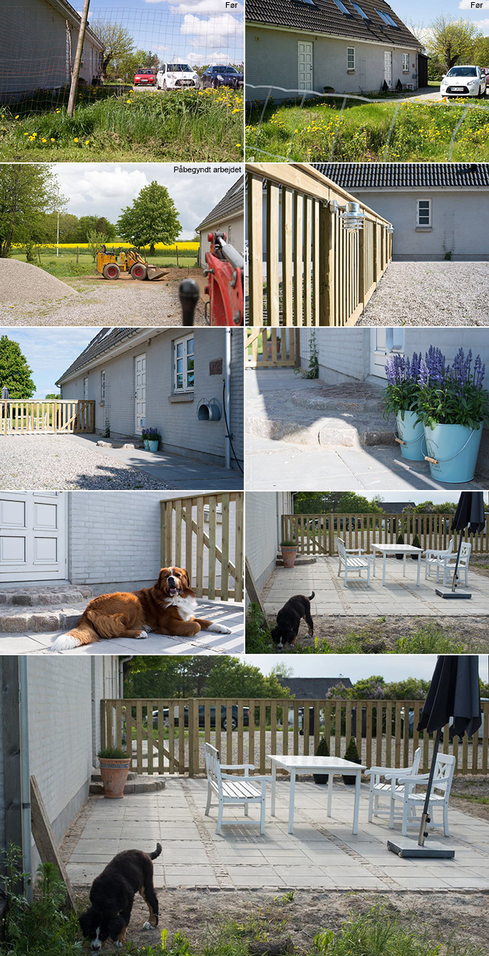 Den nye flotte og klassiske terrasse passer rigtig flot i stil og farve til det hyggelige hus. Og hegnet holder hundene inde med stil. Belysningen på hegnet giver også hygge i haven – en god idé.