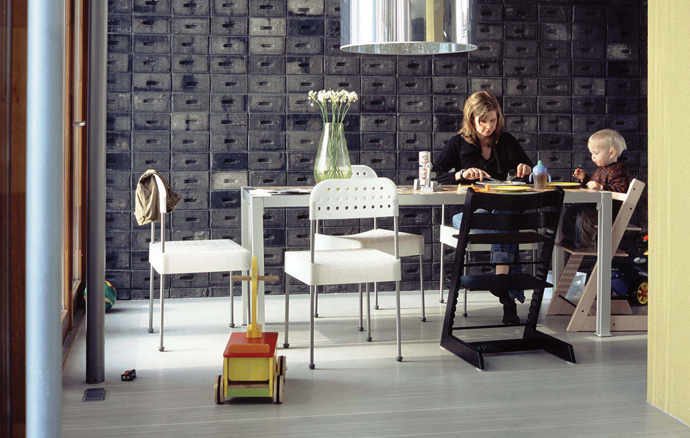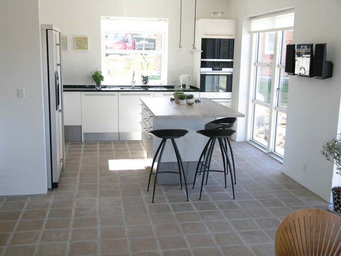 Køkken-alrummet er det mest benyttede rum i familien, og derfor er det vigtigt med en behagelig konstant temperatur og et sundt indeklima. Tommy Bisgaard forklarer, at murstensvægge i køkkenet optager og afgiver fugt, så der altid er et sundt indeklima, hvilket ofte kan være et problem i et køkken. Ved at lægge et gulv af sten, sikrer man sig også et behageligt indeklima. Tilmed egner gulvvarme sig rigtig godt til stenene, da stenene holder på varmen i længere tid, så det er mere energi-effektivt. Det murede gulv er meget slidstærkt, og hvis gulvet er behandlet, kan rødvinspletter og kaffepletter hurtigt tørres op, uden at efterlade mærker. Teglstenene skaber et mere personligt køkken, og ved at kombinere de rå mursten med hjemmets øvrige møbler, uanset om det er træmøbler eller hightech – stålmøbler, er der således masser af muligheder for at få en indretning med mere kant og personlighed.