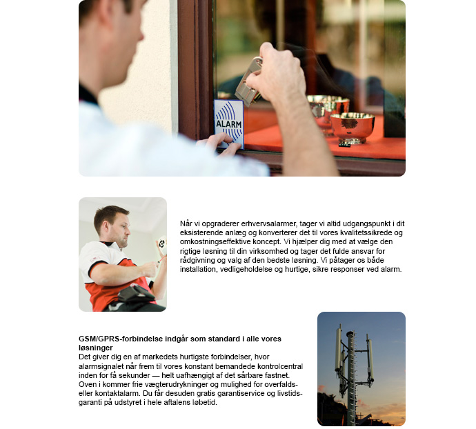 Langt fra alle alarmer og sikkerhedssystemer lever op til den standard, som virksomhedens aktiviteter kræver. Dansikring Direct tilbyder et opgraderingskoncept, som giver dig et af markedets mest moderne og effektive sikkerhedssystemer, der samtidig giver mulighed for at beholde og genbruge dele af din nuværende alarm.