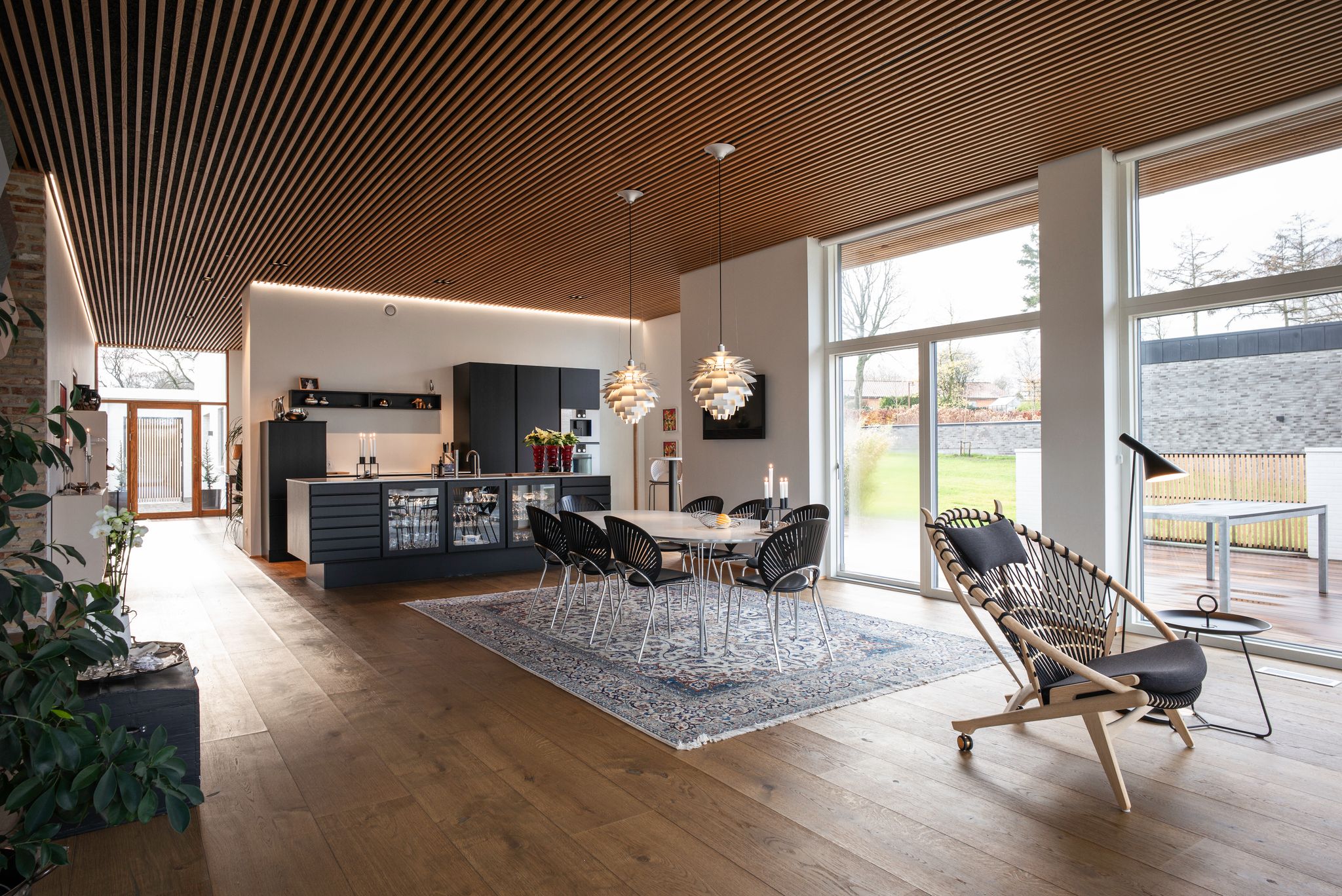 Da en familie i Kolding skulle bygge deres drømmehus, valgte de at have fokus på eksklusive og naturlige materialer for at skabe varme og trække lidt af naturen med indenfor. Derfor valgte de også Troldtekt contrast-loftet, der sikrer en optimal akustik og går godt i spænd med resten af familiens indretning.