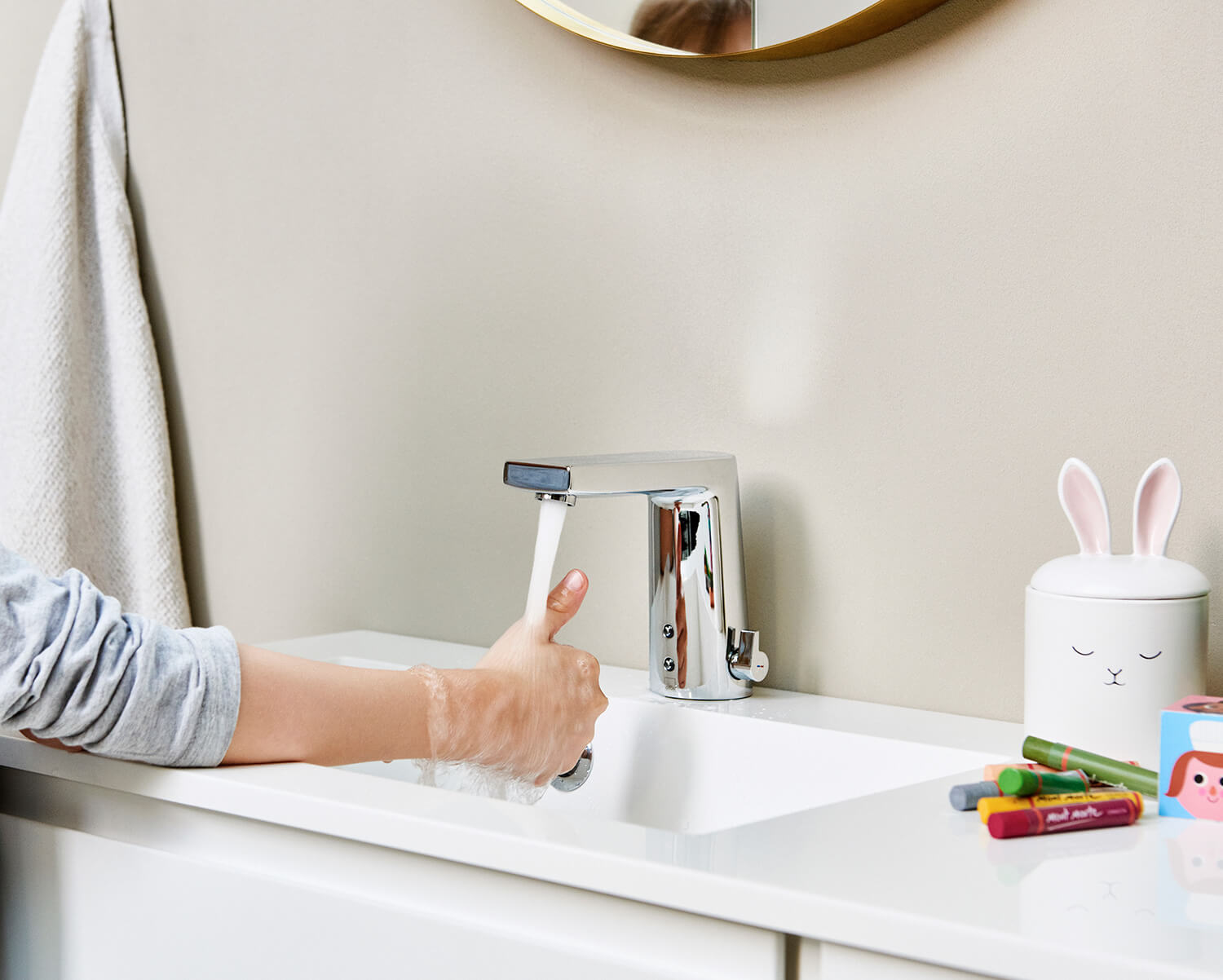 Stik hænderne ind under Oras Electra-vandhanen, så løber vandet automatisk. Den berøringsfri vandhane til badeværelset er derfor en nem og effektiv løsning til rent instinktivt at opretholde en god håndhygiejne. Og det kan især være en fordel i hjem med småbørn, som ikke altid lige ”husker” at vaske hænder efter toiletbesøget. Samtidig sparer man på vandet med Oras Electra – til gavn for både pengepungen og miljøet.