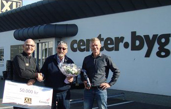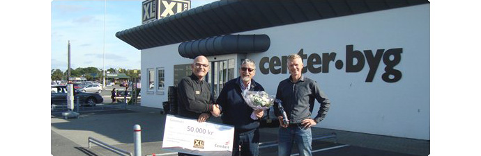 Flemming Andersen, som til daglig er kunde i XL-BYG Centerbyg i Odense, havde netop besluttet at udskifte taget på sin bolig, da han fik øje på konkurrencen på XL-BYG kædens hjemmeside. Deltagerne skulle blot fortælle om et aktuelt tagprojekt og angive det i m² for at deltage. Konkurrencens vinder blev fundet ved lodtrækning tirsdag d. 22. september. Den heldige vinder kan nu frit vælge mellem udvalgte Cembrit Toscana tagprodukter i sort, rødbrun, zinkgrå eller teglrød med dertil hørende tilbehør. På billedet modtager Sven Flemming Jensen gavekortet på 50.000 kr. til et nyt tag fra Cembrit. Gavechek, blomster og vin blev overrakt af Lennard Pedersen fra XL-Centerbyg og Søren Beier fra Cembrit.