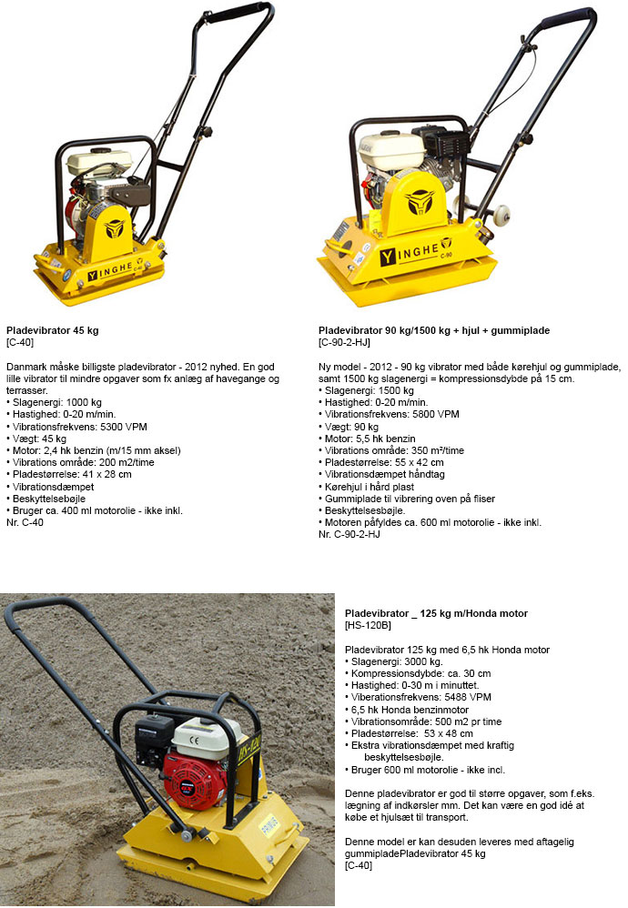 Du kan finde mange forskellige pladevibratorer når du skal lave havegang, indkørsel, terrasser eller asfaltarbejde. Pladevibratorer findes i mange forskellige vægtklasser. Det er vigtigt at vælge den rette størrelse til opgaven. Pladevibratorer kan også fås med eller uden kørehjul.