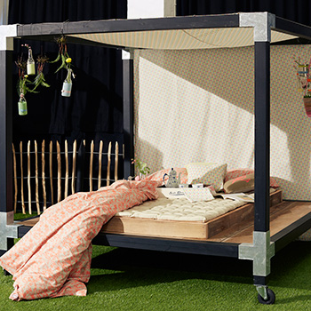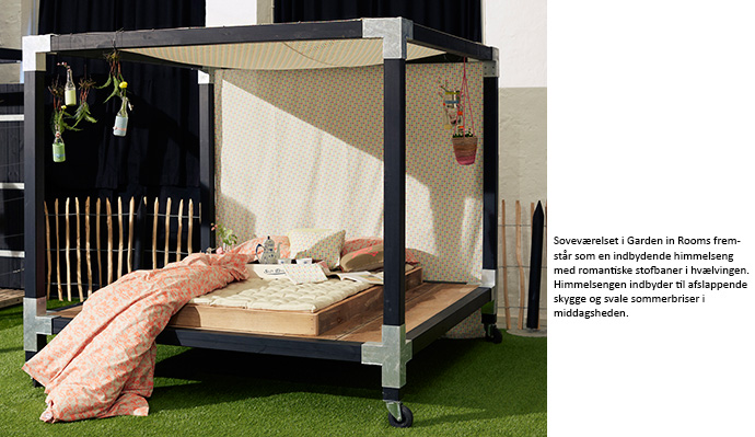 En romantisk himmelseng af sorte stolper og Cubic beslag udgør soveværelset. Her inviteres der til en lur i skyggen af florlette stofbaner, som markerer sengens hvælving med et ubekymret og enkelt udtryk. Imens leger ungerne ved hønsehuset, hvor flere timer kan bruges på at fodre høns med mælkebøtter og samle æg i kreative rammer. Når hønselugten har sat sig i børnenes hår, kan de få en skyller i det lækre udendørs badeværelse. Fødderne dyppes i en zinkbalje og håret skylles rent, inden badeområdet indbyder til lun soltørring blandt duftende sommerblomster.