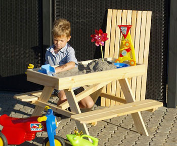 Nu er danske Plus på banen med en sandkasse, der er en integreret del af det klassiske bord- og bænkesæt til haven. Her kan børnene både sidde og stå, når der skal bages sandkager, og det betyder farvel til kolde bagdele. Samtidig giver møblet flere legemuligheder.