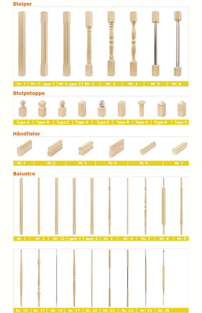 Med de forskellige trappedele kan du designe din helt personlige trappe. Gennemgå stolper, toppe, balustre, håndlister og vælg de dele der passer netop dig.