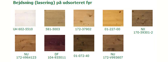 Hvis du vælger at få din ATAB trappe bejdset (laseret), så kan du vælge mellem 9 forskellige farver, eller tonet som du vil have den. Efter bejdsning udføres der altid en slutlakering således at det farvede lag ikke bortslides ved brug.