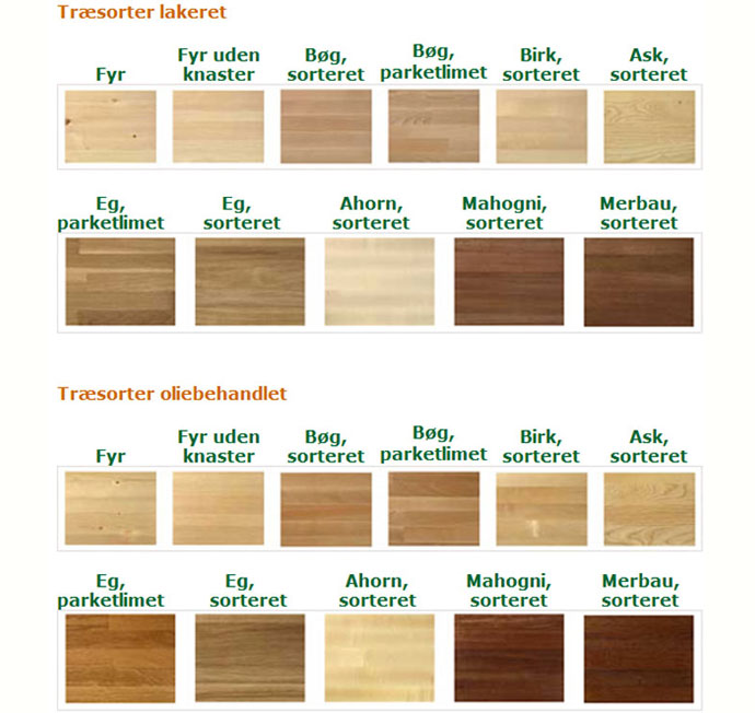 De bløde træsorter er fyr og yellow pine. De hårde træsorter er birk, ask, bøg, eg, ahorn, mahogni og merbau.