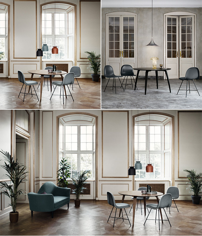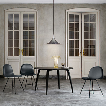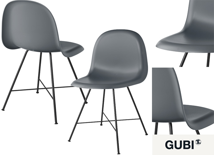 ”Den prisbelønnede Gubi chair nu med nyt elegant sortmalet metalstel, model f1, upolstret med skal i HiRek eller finér, eller forsidepolstret med deraf følgende forbedret siddekomfort. Kan ses i 1000CHAIRS nu.”