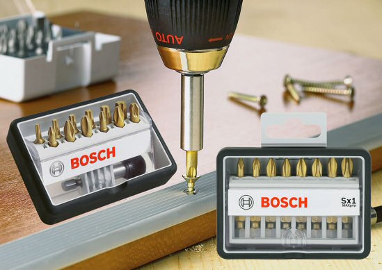 Bosch leverer de nye sæt i kvaliteterne Extra Hart og Maxgrip og i to størrelser. I den lille version findes der i hver af de to kvaliteter tre sortimenter med bits i forskellig størrelse: Otte 49 millimeter-klinger, otte bits plus universal Quick Change bitsholder eller 12 bits og holder. Det store sæt indeholder 18 Maxgrip- eller Extra-Hart-bits samt en universal bitsholder.