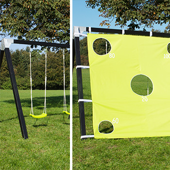 Udeleg og udfordringer i haven giver røde kinder og masser af energi. Skal motorikken udfordres, er en gynge et oplagt valg. Med et snuptag kan gyngestativet ændres til at blive en målvæg, så kan hele familien tage en rask kamp om, hvem der er bedst til at ramme plet.