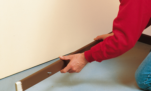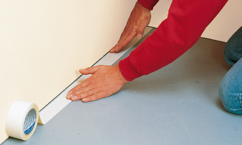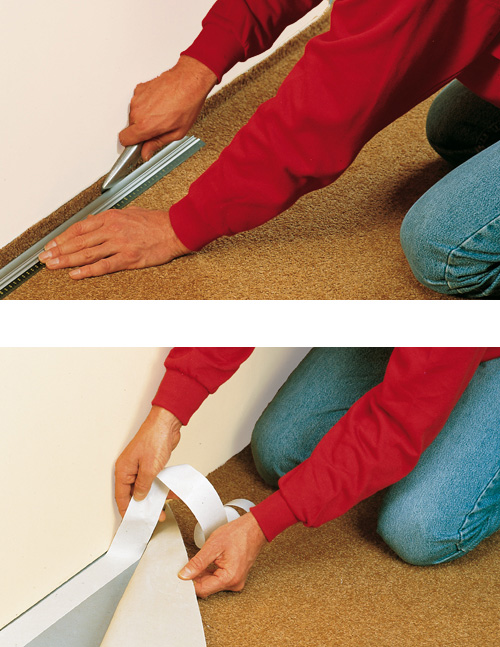 5. Først når tæppet er skåret til og ligger nøjagtigt som det skal, fjerner du beskyttelsespapiret fra tapen langs væggene. Pres tæppet fast. Fejelisterne kan nu også sættes på igen, og tæppet vil blive liggende godt og smukt.