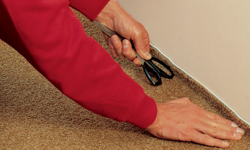 4. Tilskæringen langs væggene kan nu begynde. Med linealen presser du tæppet fast i vinklen mellem væg og gulv. Læg kniven an mod linealen og pres hårdt ned – helt ind mod væggen. Før kniven med fast hånd langs linealen. Indhak, rør, karme osv.: Skær vinkelret ud fra væggene og derefter rundt om forhindringen. Luven vil skjule snittet. Brug evt. en strimmel tæppetape til at holde kanterne fast.