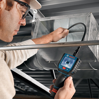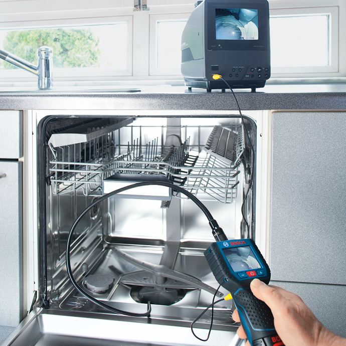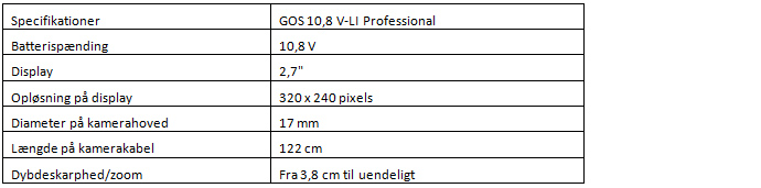 Men nu er det muligt at undersøge selv de mest ufremkommelige og trange steder med det lille smarte inspektionskamera GOS 10,8 V-LI Professional fra Bosch. Når det 122 cm lange kamerakabel med det kun 17 mm lange kamerahoved føres ind i fx et rør, kan man følge med via billeder på det 2,7 tommer store LCD-display. Billedet står skarpt og tydeligt takket være den høje billedkvalitet på 320 x 240 pixels, og en realistisk farvegengivelse gør det nemt at se alle detaljer.