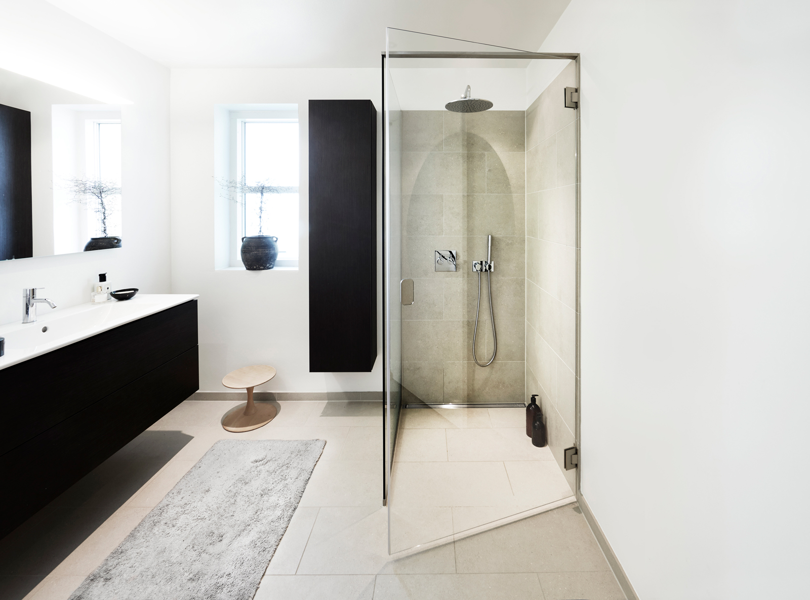 Rå overflader, naturmaterialer og et personligt touch ned til mindste detalje. Badeværelset er blevet et af boligens mest intime rum, hvor vi udtrykker vores personlighed med levende lys, luksuriøse håndklæder på knagerne og planter i vindueskarmen. Fornemmelsen af ro og overskud fuldendes af de store fliser på gulv, vægge og i brusenichen, der skaber et harmonisk udtryk.