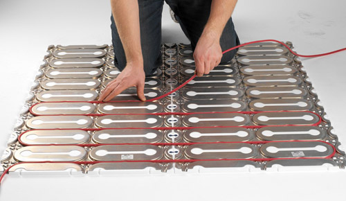 Gulvvarmesystemet fra DEVI leveres som varme- og isoleringsplader, der gør det nemt for fagfolk at montere gulvvarmen direkte oven på det gamle beton- eller trægulv, og et helt nyt trægulv med gulvvarme kan derfor installeres på bare én dag.