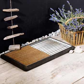 Er huset fyldt med legeglade poder, så vælg den store rist med en måtte i midten eller sammensæt fire små moduler, så der er masser af plads til familiens mudrede sko og støvler. Skal stilen være mere rå, er det oplagt at indrette indgangen med to stålgrå riste i harmoni med indkørslens grå perlesten.