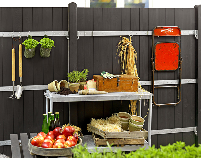 Hold orden i haveredskaber og urter med de smarte ophængsdetaljer på portelementets beslag fra Plus.