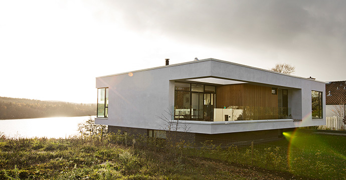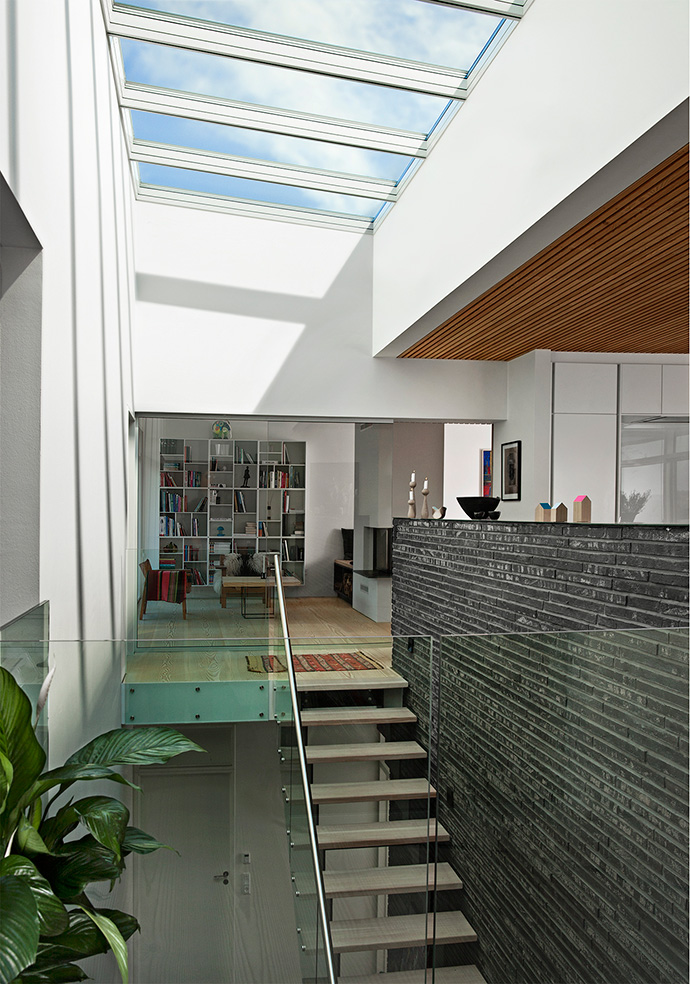 Den store bare væg skaber refleksion af dagslyset fra VELUX ovenlysmodulerne, så det når ud i alle kroge i huset med det flade tag.