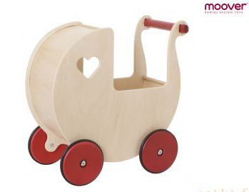 Charmerende dukkevogn i træ, med hjerte i kaleche fra Moover. Findes både i natur og i rød.