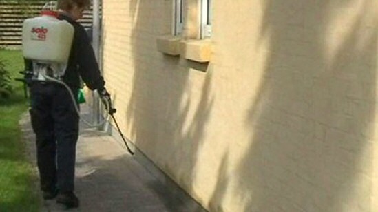 Der sprøjtes på soklen, under sålbænke og andre relevante steder rundt om bygningen – eventuelt også på flisearealer, som støder direkte op til bygningen, så der dannes en barriere mod indtrængen af myrer.