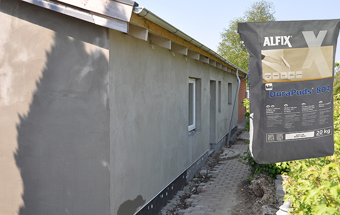 Alfix DuraPuds 804 påføres i et tyndt lag med stålbræt. Når pudsen er fingertør, filtses overfladen med fugtig svamp eller filtsbræt for at opnå et heldækkende og ensartet resultat.