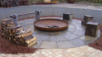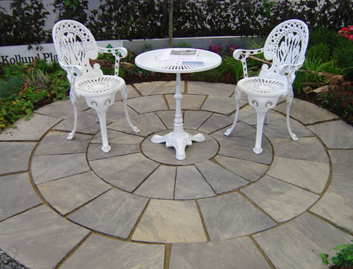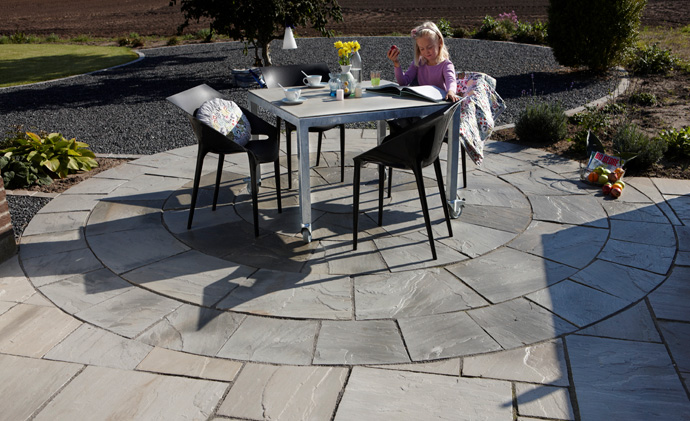 Sandsten er ikke nødvendigvis firkantede. Lad buerne lege med i geometrien. Den smukke cirkel-terrasse er et populært valg når der skal laves et lille åndehul f.eks. bagerst i haven. Eller på en smuk plet ned til vandet.