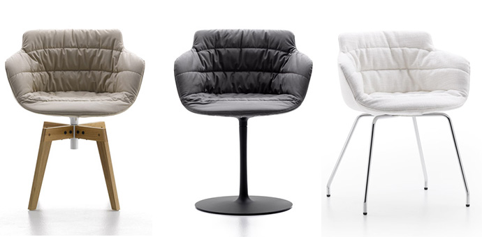 Flow stolen er en smuk fuldpolstret stol som laves med forskellige understel. Træstellet i egetræ er elegant til stolen og har indbygget drejefunktion. Søjlestellet er lavet i retro-stil og laves i sort og hvid. Dertil kan stolen fås på 4 ben eller medestel i stål.